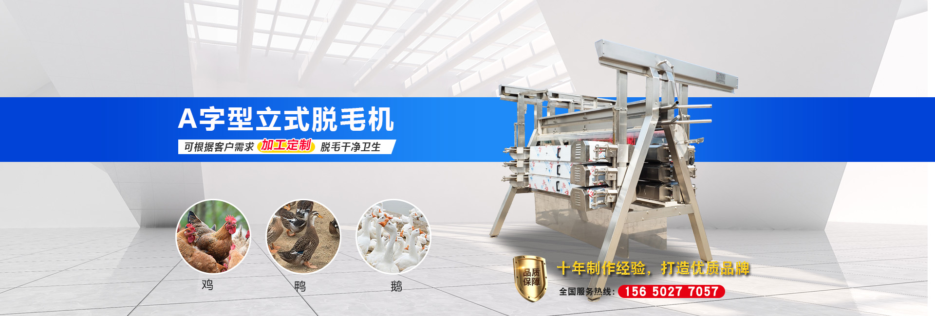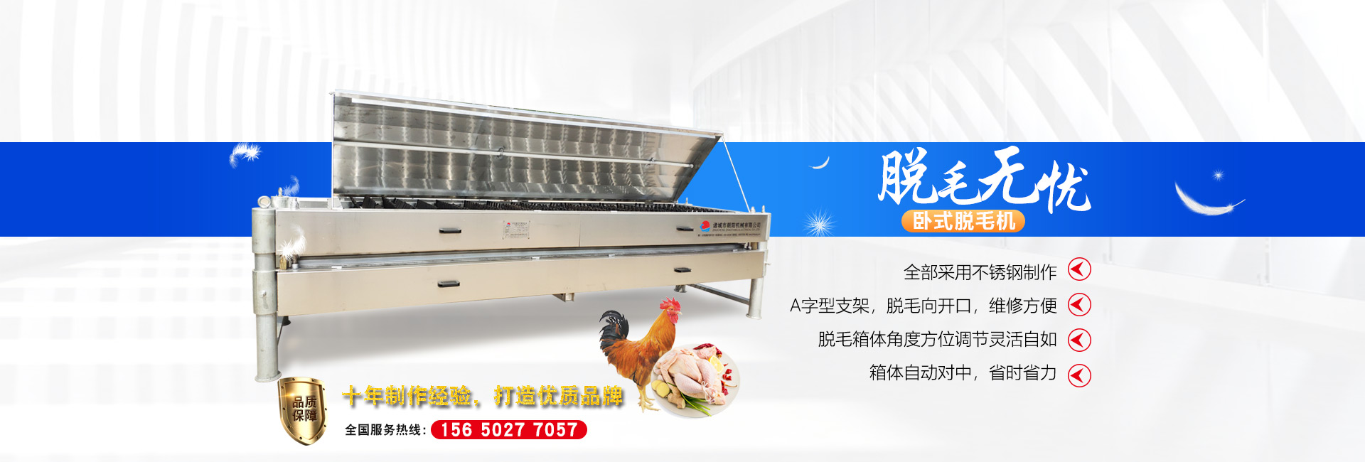 公司長期與國內外屠宰加工企業合作,走引進——消化——創新和自主研發(fā)相結合的道路,在國內外同類產品的基礎上,不斷更新和改造。公司主要設備有:A字型立式脫毛機、臥式脫毛機、強力噴淋機、松毛機、浸燙池、螺旋預冷機、禽籠清洗機、電暈機、兔扯皮機、兔割前爪/后爪機、剝胗機、自動洗鉤機、螺旋燙爪機、雞爪脫皮機、分割輸送帶等屠宰用設備。其中,公司獨力發(fā)明生產設計的“電動調節(jié)脫毛機”及“自動控水控溫浸燙池”順利通過知識產權局的實質性審查。公司所生產的設備 可與國外同類產品配套使用,設備遠銷阿爾及利亞、澳大利亞等中東、非州等并建立了長期穩(wěn)定的合作關系。